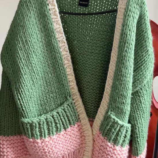 This cardigan blends comfort and style. Its chunky knit offers coziness for cooler days, while the green-pink-cream color-block design adds vibrancy and makes it a standout. Versatile with jeans (casual) or dressed up, it has unique charm.